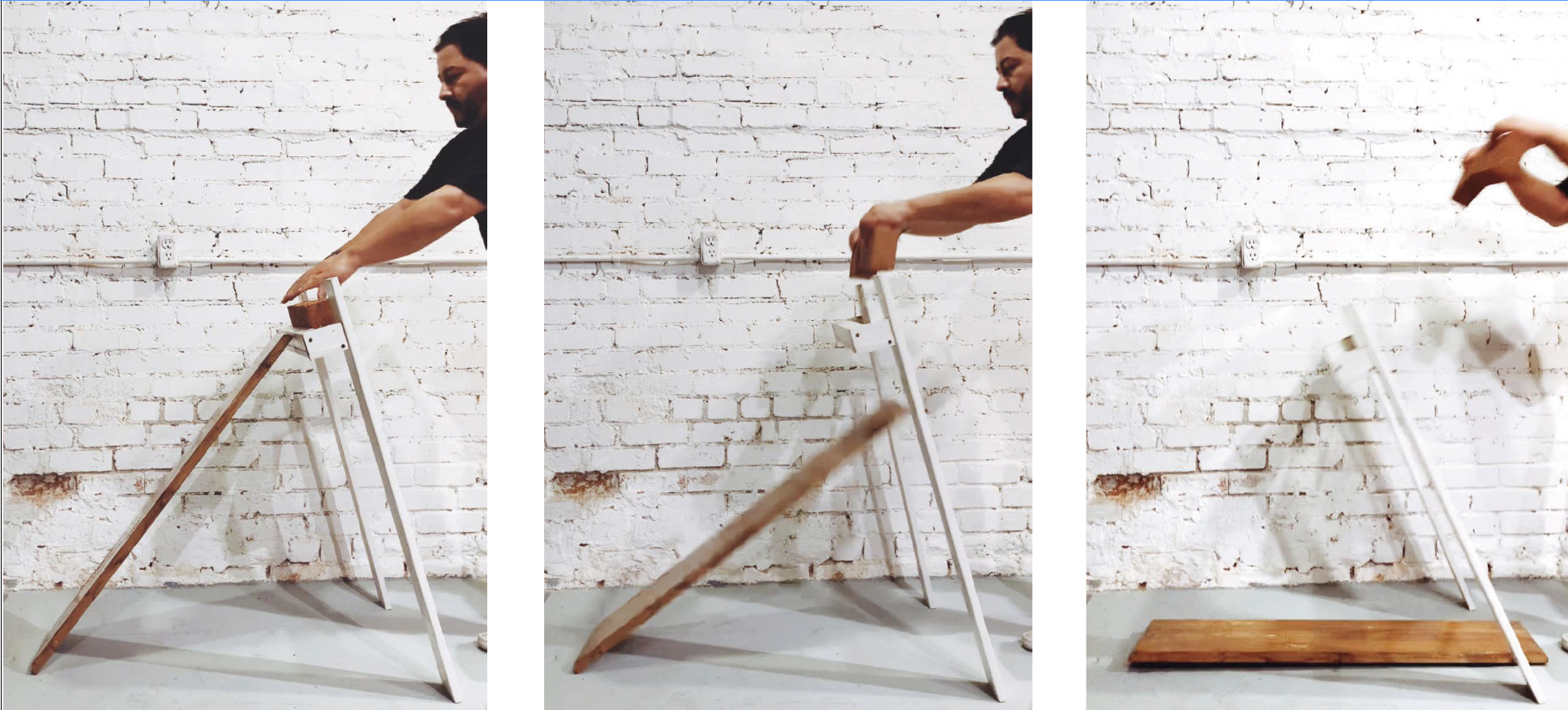 Noé’s installations display an environment that is at once an environment of graceful balance and crude counterbalance, thus a sense of tension. The result is an anticipation of a disaster, the expectancy of a cataclysmic fall. Through his video projections, he reveals the catastrophic result of the pieces when they collapse as Noé removes their source of balance, stress, and weight - that typically being the bricks.